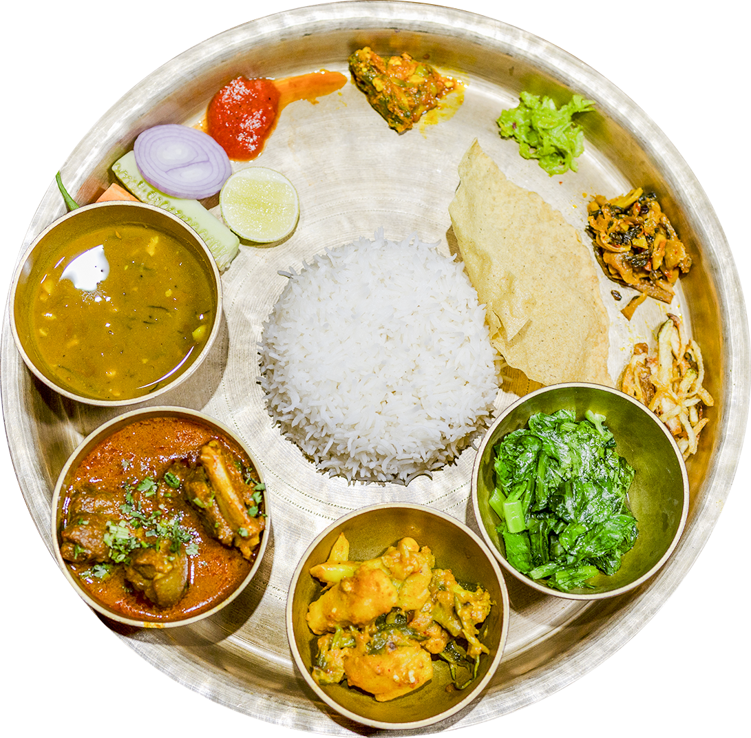 Thakali Khana is a traditional, nutritious Nepali set meal originating from the Thakali community in the Mustang region. It features rice or buckwheat dhido, flavorful lentil soup, seasonal vegetables, gundruk (fermented greens), pickles (achar), and often mutton or chicken. Known for its distinct, aromatic, and comforting flavors, it is a balanced, highly popular platter.